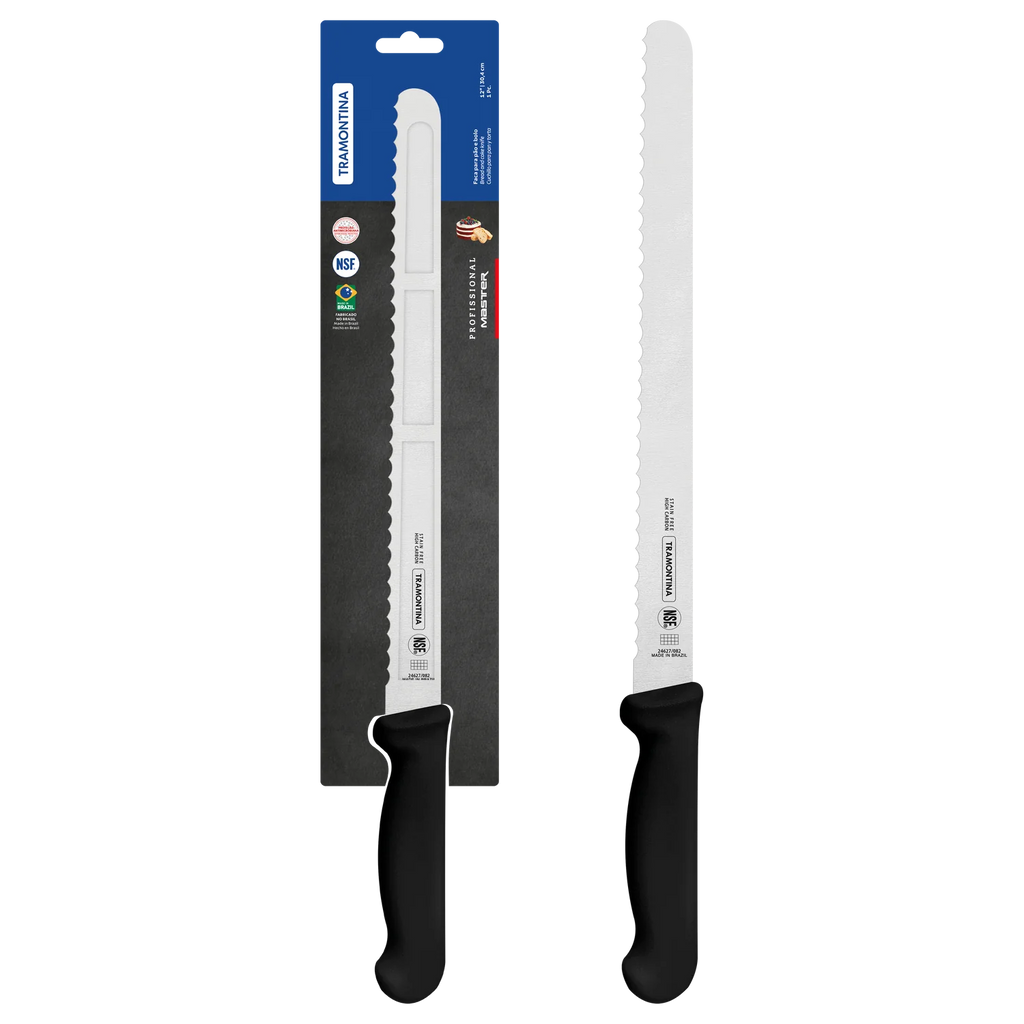 Featuring a sleek black design, the Tramontina Professional Master Bread Knife provides precision and control for slicing bread. With its 12" size, it easily cuts through any loaf, making it an essential tool for any kitchen. Improve your bread cutting experience with the Tramontina Professional Master Bread Knife.