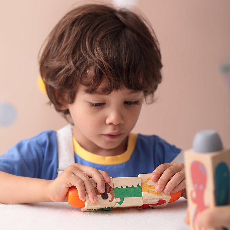 Unlock a wild world of imagination with the Twistable Wooden Jungle Animal Puzzle Block. Featuring jungle animal designs on each side, these twist lock block offers a playful twist on classic block play. Engage in imaginative play while developing vital cognitive skills and constructing four distinct animal pictures.