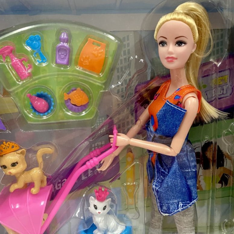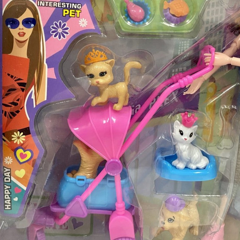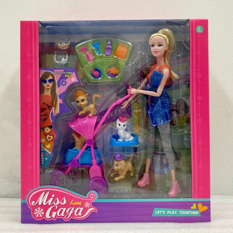 Introduce your child to the fun world of playtime with Vibrant Miss Gaga With Pram & Pets! With this set, they can imagine taking their baby and pets for a stroll. Made with vibrant colors and durable materials, this toy encourages creativity and role-playing, while strengthening fine motor skills.
