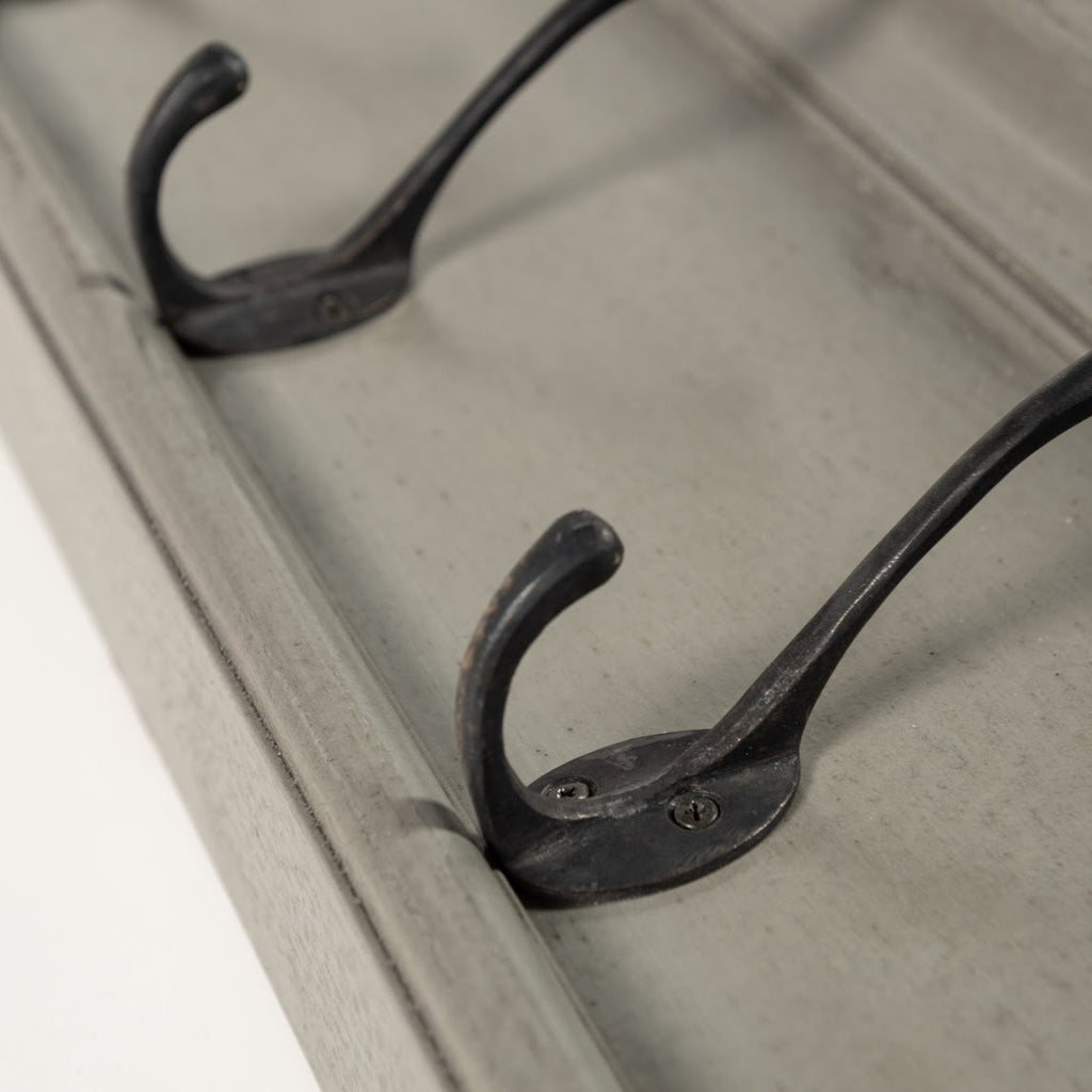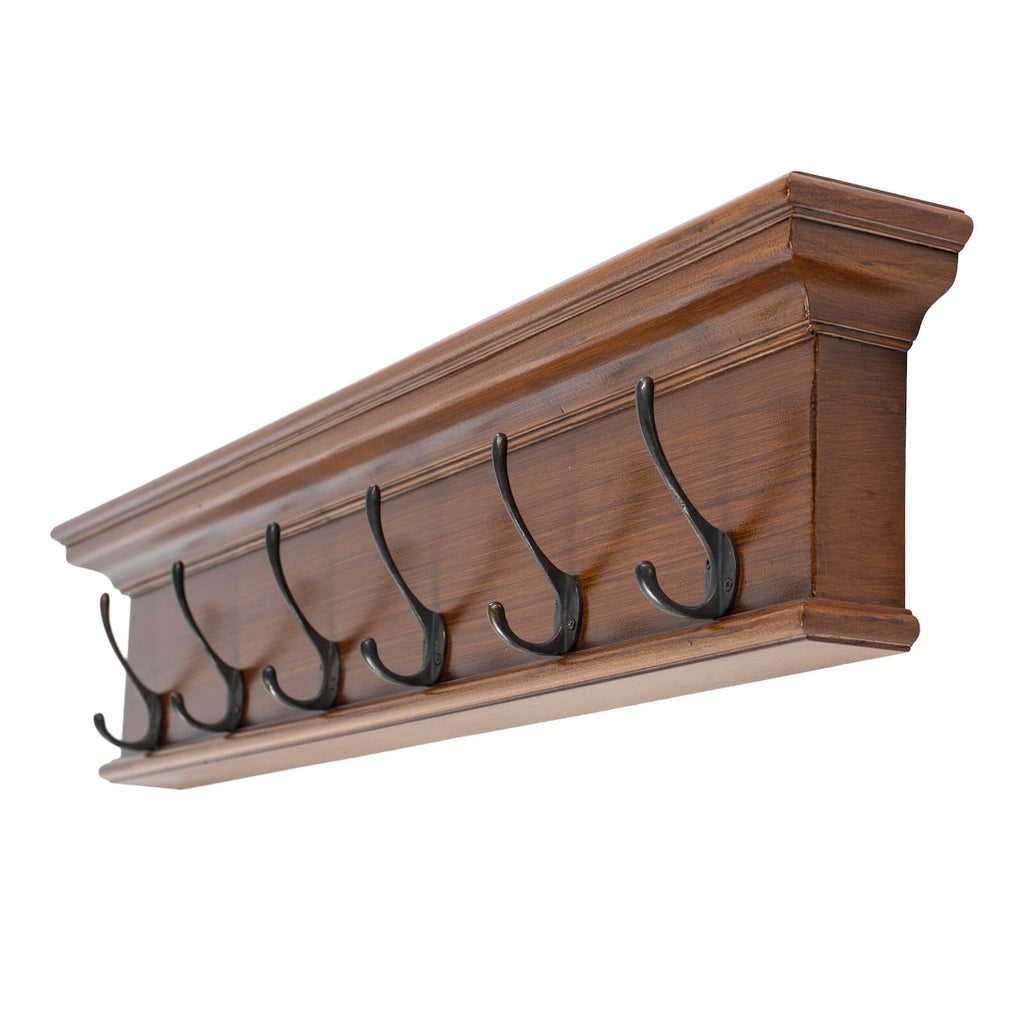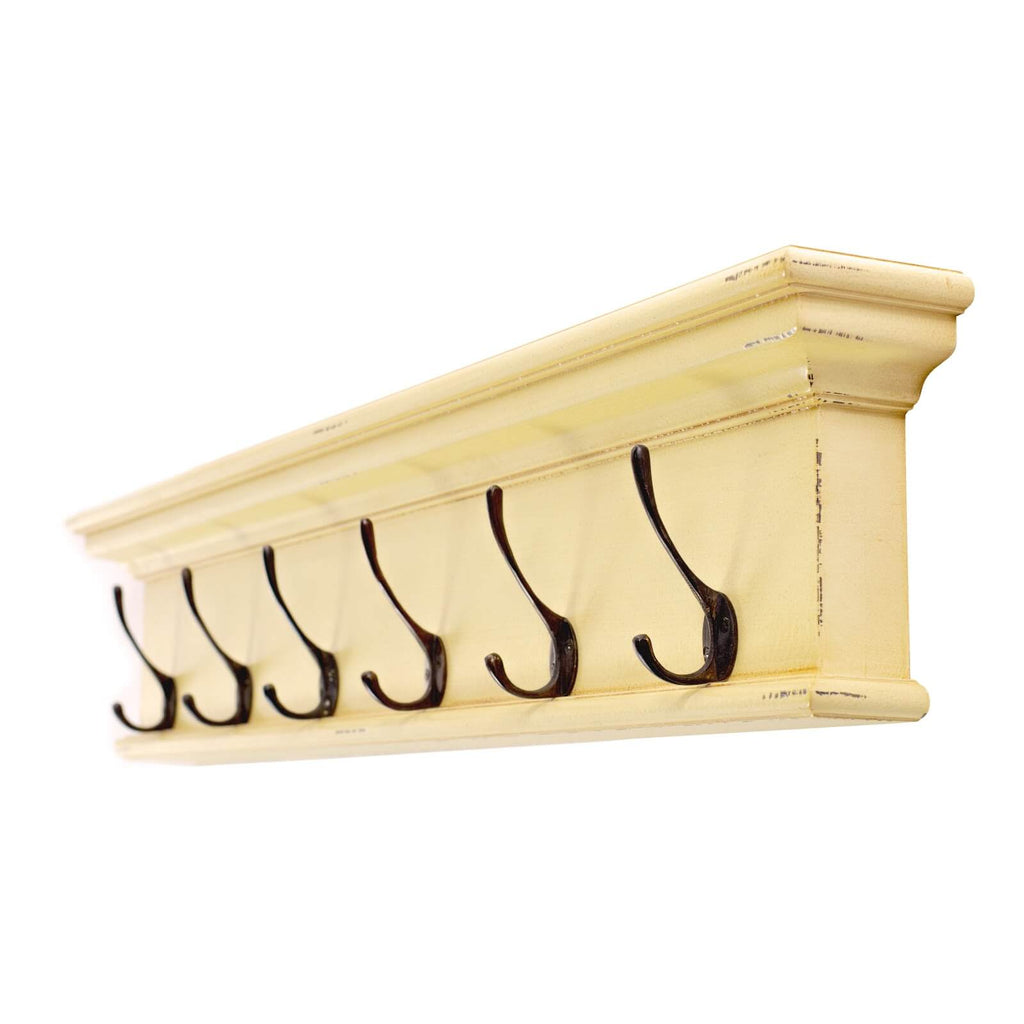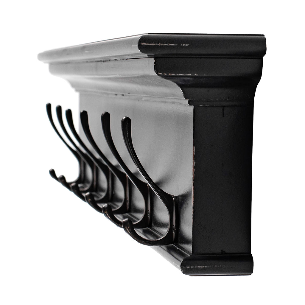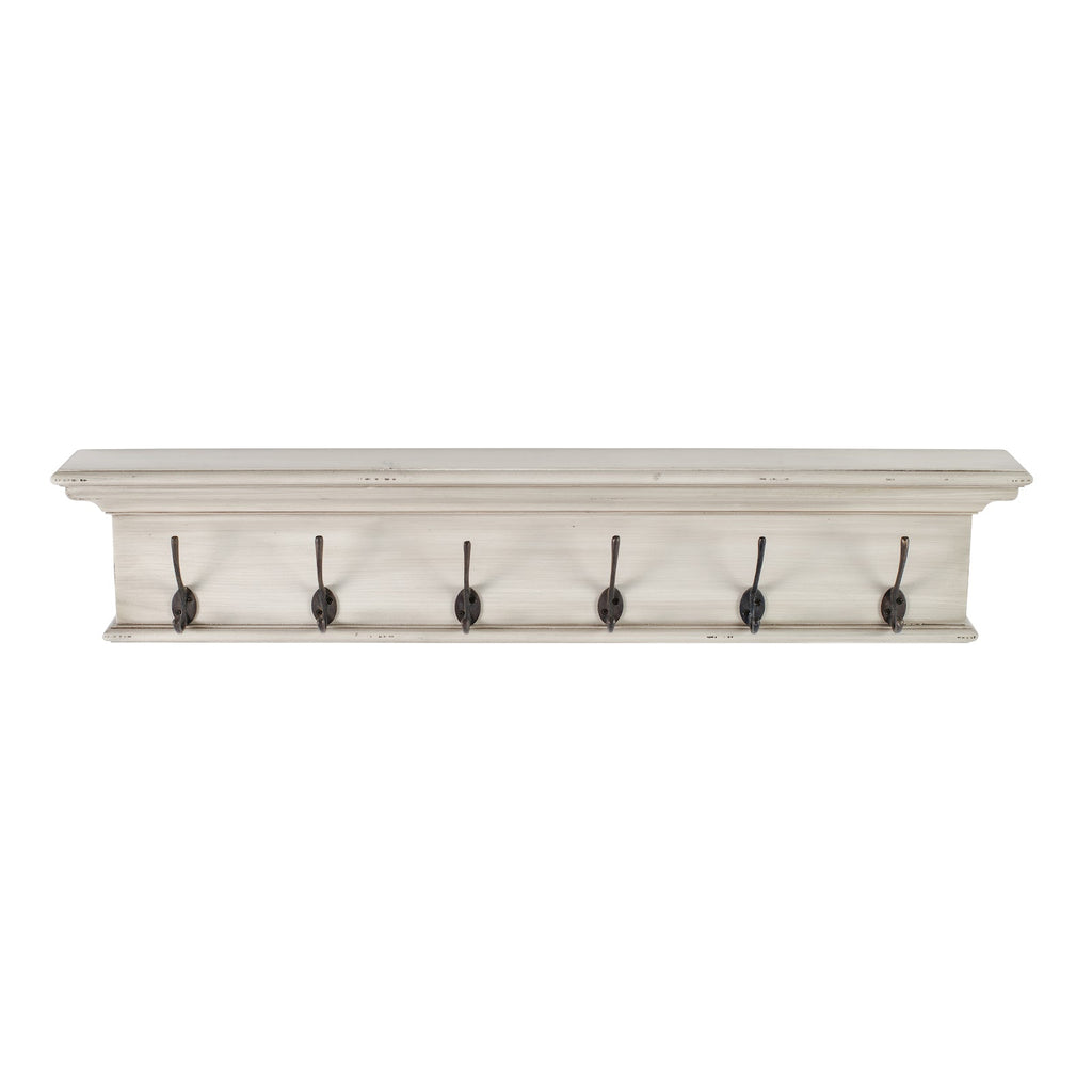 Bring a touch of unique style to your home with this wall-mounted coat rack. Showcase your decorative items on the shelf and hang your coats, keys, and handbags on the six large, antique brass hooks. It's the perfect way to declutter your entryway and make a bold statement!