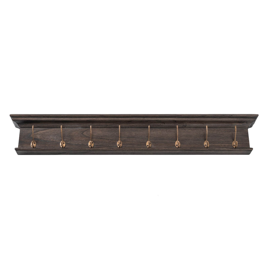 Bring a touch of unique style to your home with this wall-mounted coat rack. Showcase your decorative items on the shelf and hang your coats, keys, and handbags on the eight large, antique brass hooks. It's the perfect way to declutter your entryway and make a bold statement!