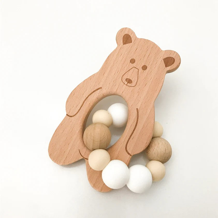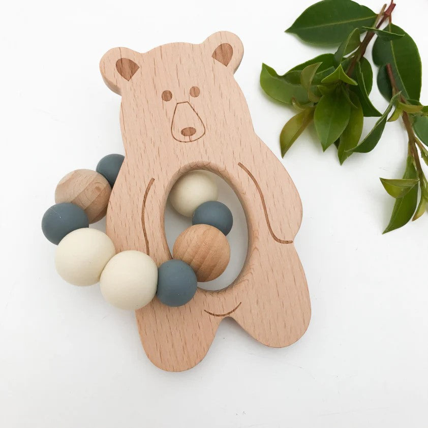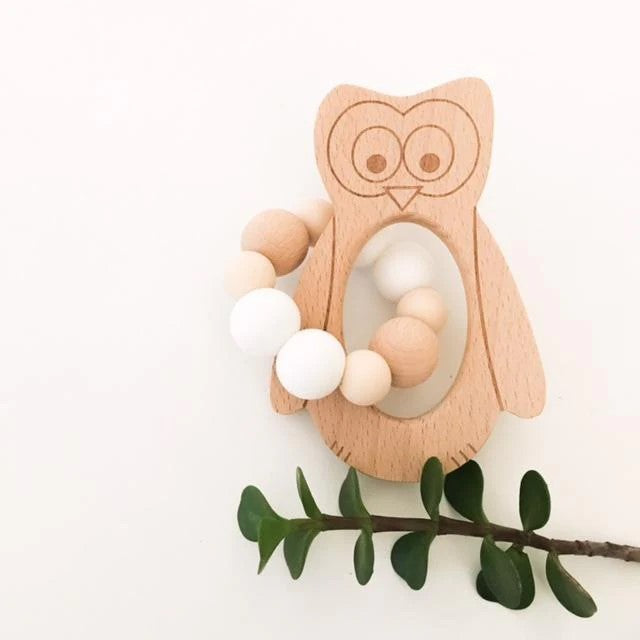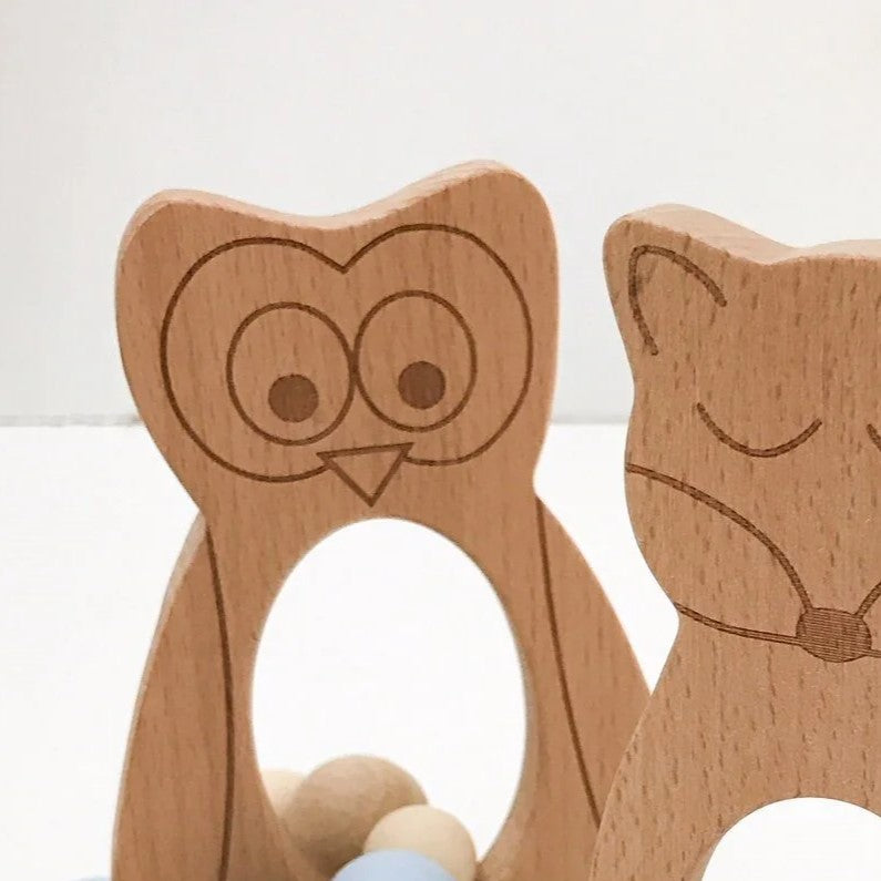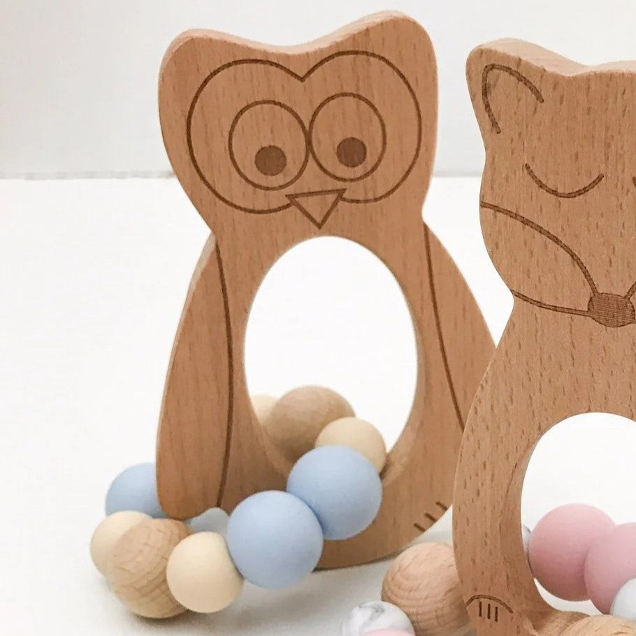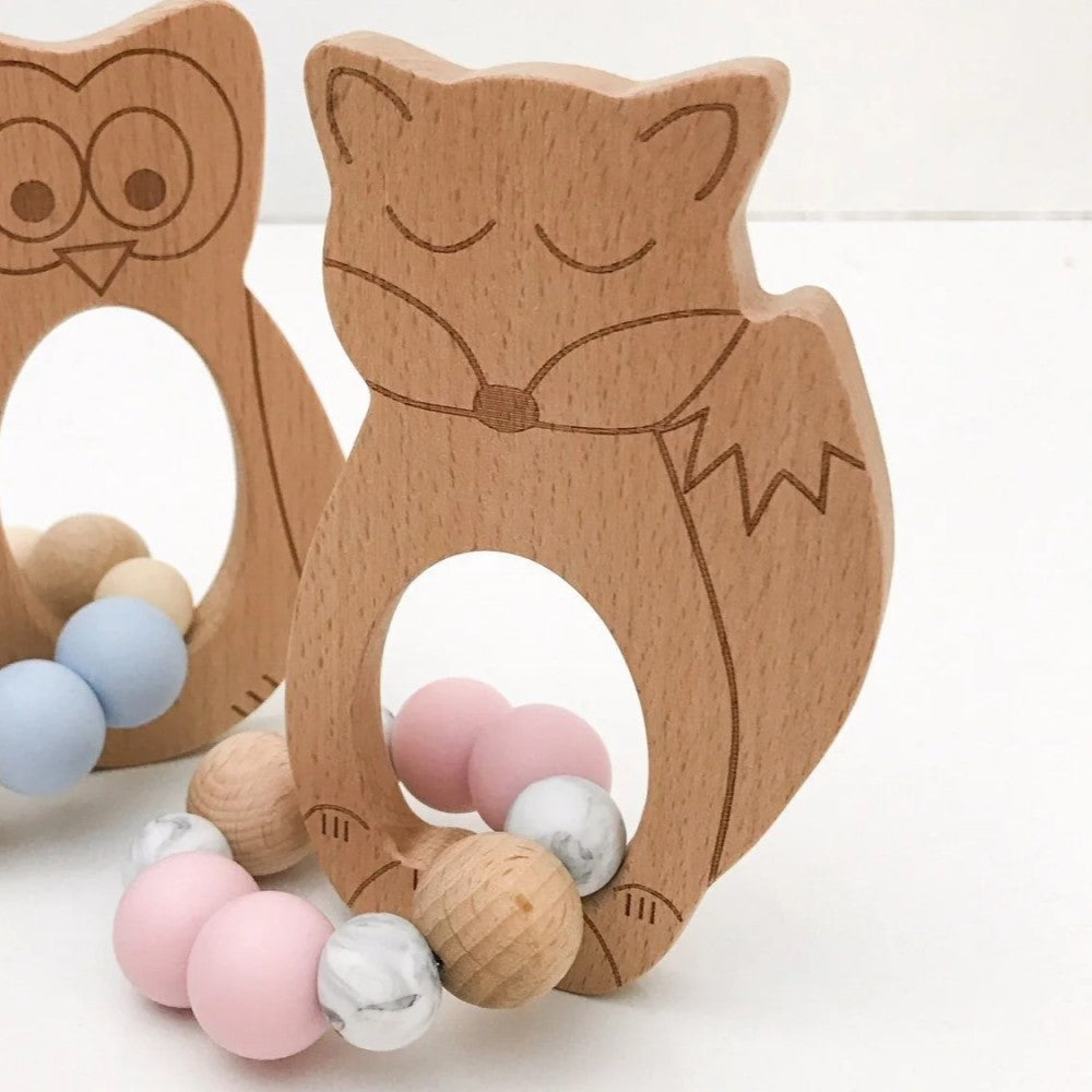 The Personalised Woodland Silicone and Wood Teether is the perfect solution for your little one's teething needs. Made with naturally antibacterial beech wood and a soft silicone ring, it soothes sore gums while providing added texture and a gentle rattle sound. Choose from three adorable woodland Fox, Owl & Bear characters and four colors.
